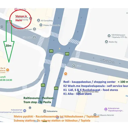 Bu daire, Agroksenkuja otobüs durağından sadece 400 metre mesafede bulunur; Kalasatama metro istasyonu ise 5 dakikalık bir yürüyüş mesafesinde yer alır.